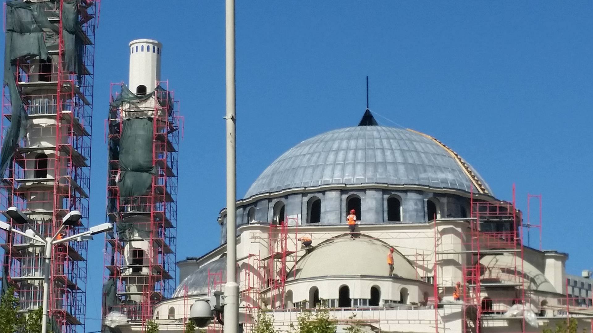 Akrobaci në ajër të pastër, në mes të Tiranës! Punëtorët që po punojnë tek xhamia e madhe tek Parlamenti, me një guxim të pashembullt, pa rripa sigurimi e pa skara mbrojtëse, ngjiten e zbresin tek njëra nga kubetë.