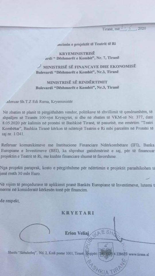 Partia Demokratike, nëpërmjet ish deputetes Jorida Tabaku, ka bërë me dije sot se ka zbuluar një dokument, sipas të cilit, Erion Veliaj, Kryetar i Bashkisë së Tiranës, do të marrë 30 milionë euro kredi për projektin e kompanisë Fusha për teatrin. Sipas ish deputetes Tabaku, në një kohë krize të thellë, kryebashkiaku do të shtojë më shumë borxhin e shqiptarëve. Ajo tha se Veliaj është “njeriu që duhet të largohet një orë e më parë nga kryebashkiaku për tu hetuar nga Prokuroria për shkeljet ligjore”.