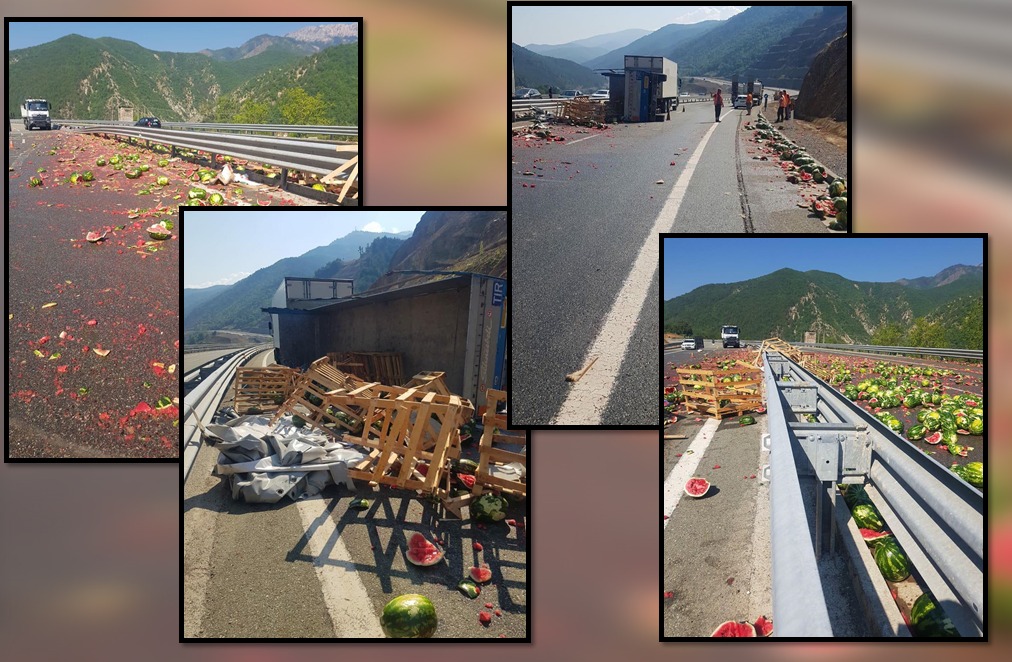 Një aksident ka ndodhur në Rrugën e Kombit. Soç shihet edhe në fotot e mëposhtme, një kamion i ngarkuar me shalqi, ka humbur kontrollin, është përplasur me bordurën e rrugës dhe është përmbysur. Kjo përplasje ka shkaktuar derdhjen e të gjithë bostanëve në rrugë, çarjen e tyre dhe ‘përmbytjen’ e Rrugës së Kombit.