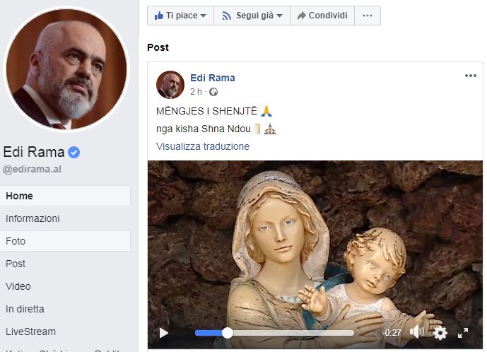 Kryeministri i vendit Edi Rama e nisur këtë të shtunë me një video, nga Kisha e Shna Ndoun.  Video e shpërndarë në rrjetin zyrat të “FaceBook”, uron gjithë besimtarët për këtë ditë të shenjtë.