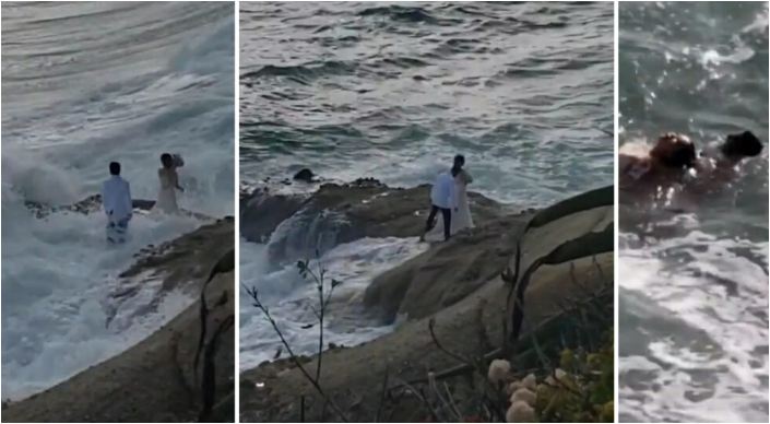 Klipi i dasmës për pak sa nuk është kthyer në tragjedi për një çift në Kaliforninë e madhe. Ata ishin duke bërë një set forografish në momentin kur një dallgë e madhe i ka marrë me vete në Oqeanin Paqësor, duke shkaktuar momente paniku.